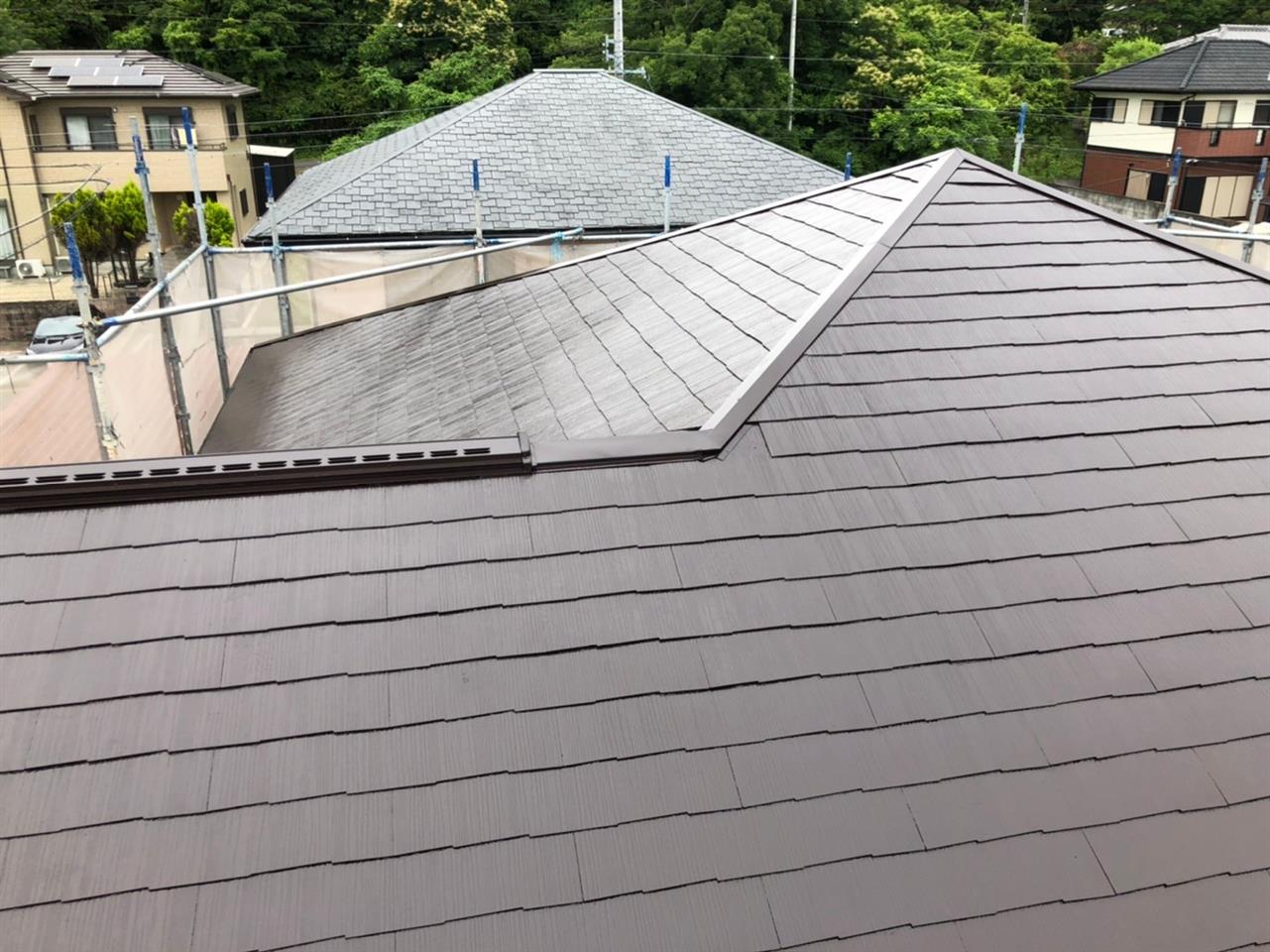 ホームページより口コミを頂きました。今回は屋根塗装のみの工事になります。2階が暑いとご相談が有りましたので弊社ご提案の遮熱塗料にて施工致しました。色もお任せと言うことで濃いブラウンにて仕上げさせて頂きました。同時に外壁塗装の点検も行いました、一部コーキング処理を行いました。次回、壁塗り替え工事をお約束して頂きました。ご依頼ありがとうございます。~仕様材料~屋根塗装:遮熱無機塗料