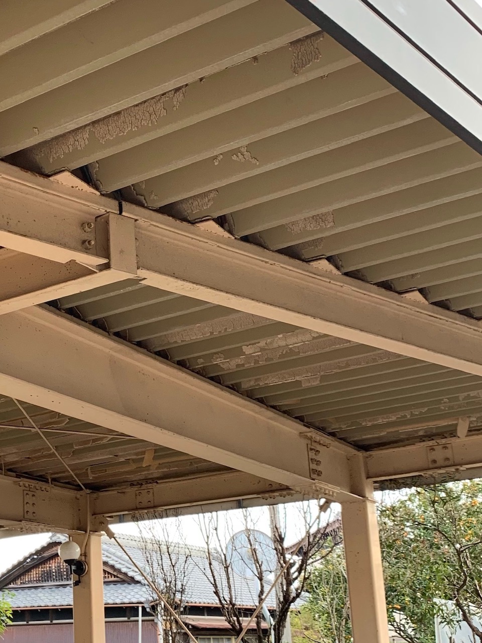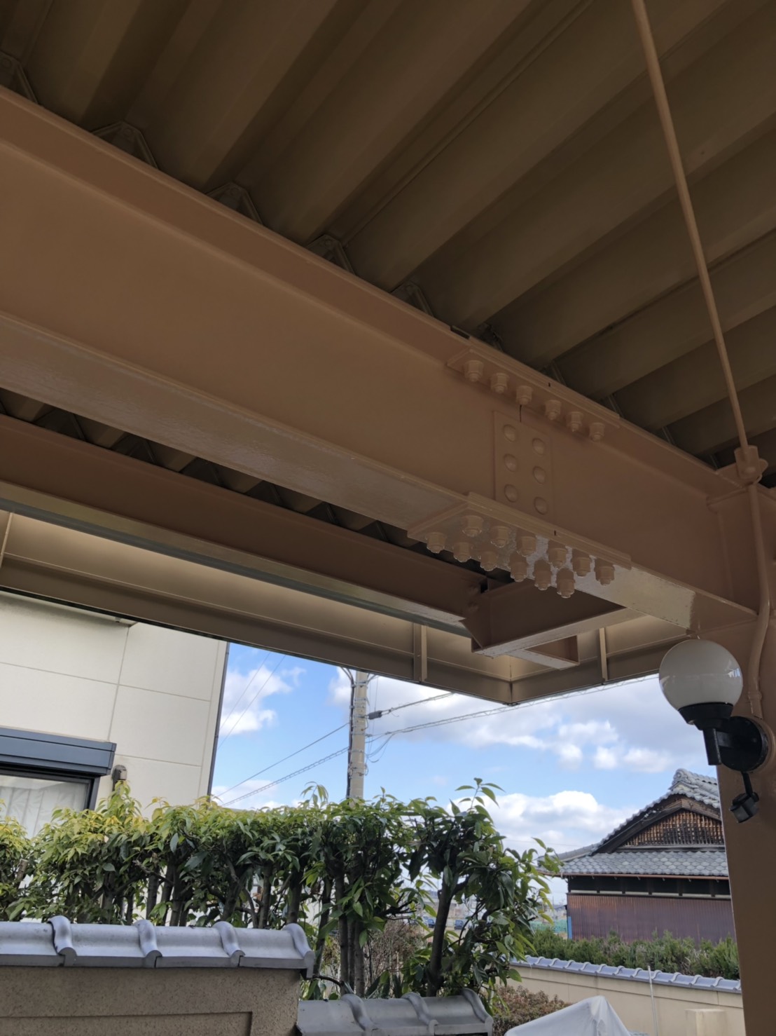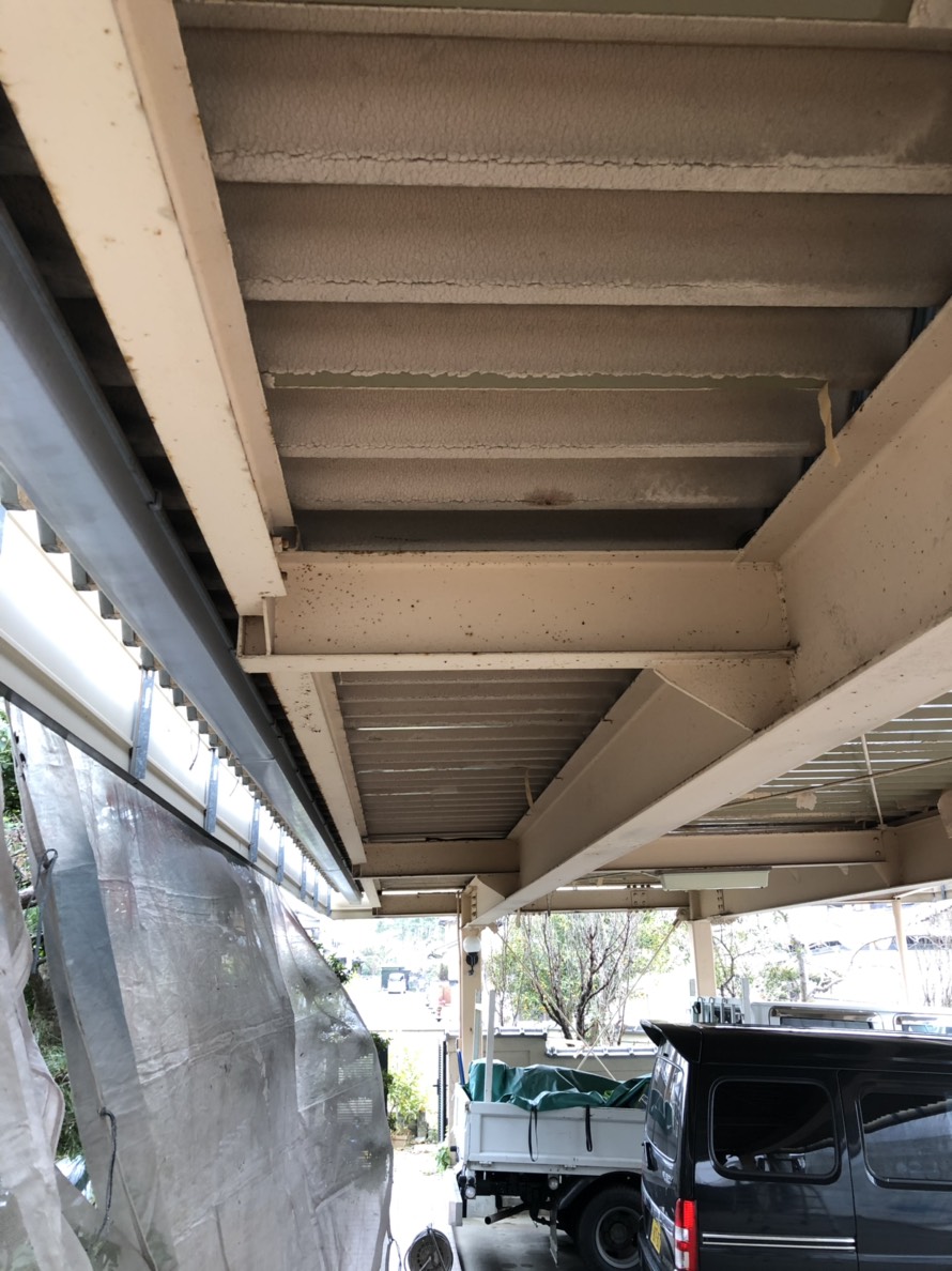 ホームページより口コミを頂きました。大事なお車が剝がれ落ちた結露防止材の粉ですぐに汚れるとご相談が有りました。上裏の結露防止材が剝がれ大変傷んだ状態でした。手間のかかる作業でしたが綺麗に除去し、塗装致しました。お色に悩まれていましたので弊社ご提案の元々の色を選択致しました。同時に外壁塗装の点検を行い少しコーキング処理を行いました。新品になったと言われ大変喜ばれていました。ご依頼ありがとうございます。~仕様材料~折半屋根、鉄骨:2液シリコン塗料
